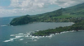 4) Huelo ("hoo-ay-low"), Hole-in-the-Rock, Jurassic Rock. Flying along the coast you will pass several homes, some of which are perched right on the edge of the sea cliffs. Several famous personalities inhabit Maui's North Shore, including Sammy Hagar, George Harrison, Jim Neighbors, and Kris Kristoltsen. Where the houses end and the rain forest begins demarks the end of Huelo. Down on the coastline, you will pass the curious rock formation known as "Hole-in-the-Rock", followed by Jurassic Rock, which you may recognize from the movie of the same name. Thereafter you will pass beautiful Honomanu bay, followed by Keanae peninsula. It is not uncommon to see dolphins in Honomanu bay, but lookout for the overhead power lines and the steeply rising terrain if you venture too far in-shore.